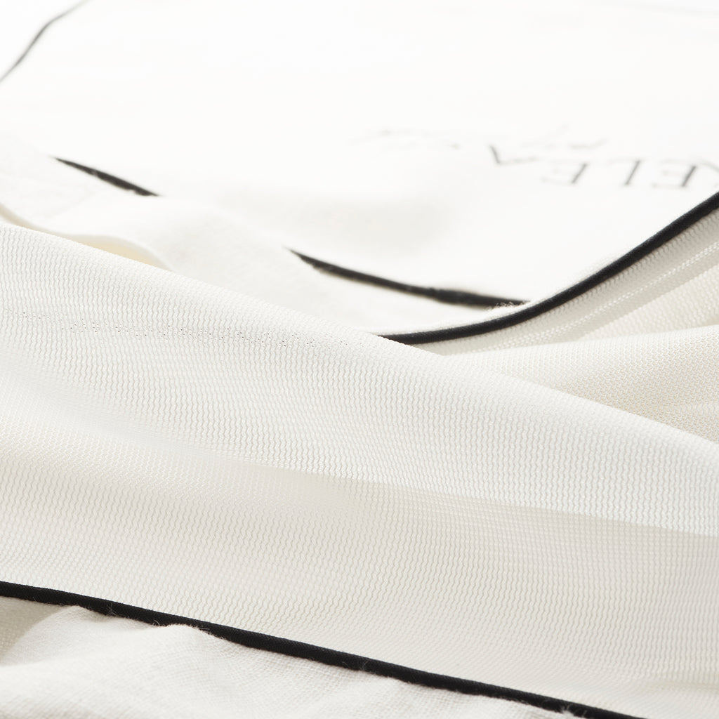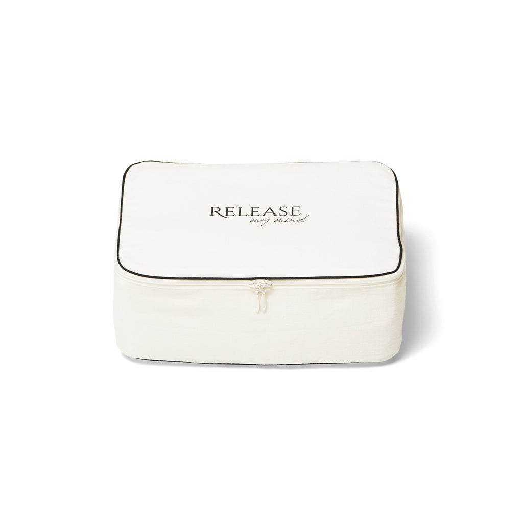 しなやかな糸で紡がれたホワイトリネンと洗練されたブラックパイピングが上品なトラベルポーチ。『RELEASE my mind』のメッセージデザイン。3つある同ポーチシリーズのMサイズ。スーツケースの中を美しく収納できるパッキングキューブです。通気性の良いリネン生地と底部分にメッシュ生地を使用しているので湿気がこもりません。ハンドル付きで持ち運びにも便利。